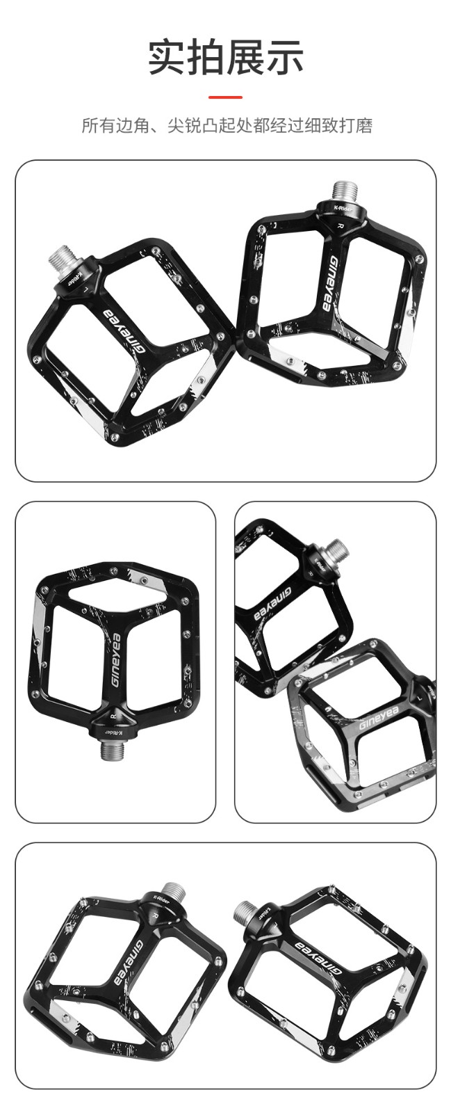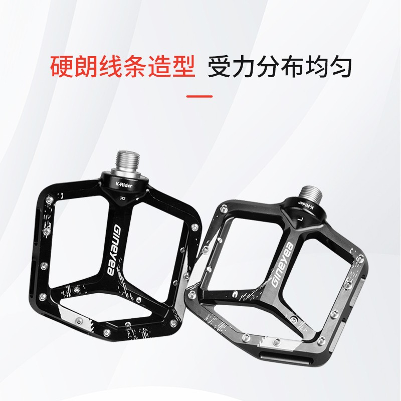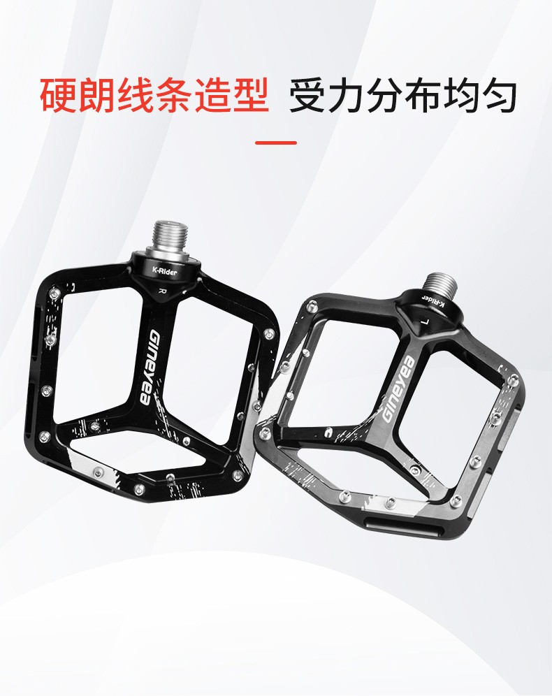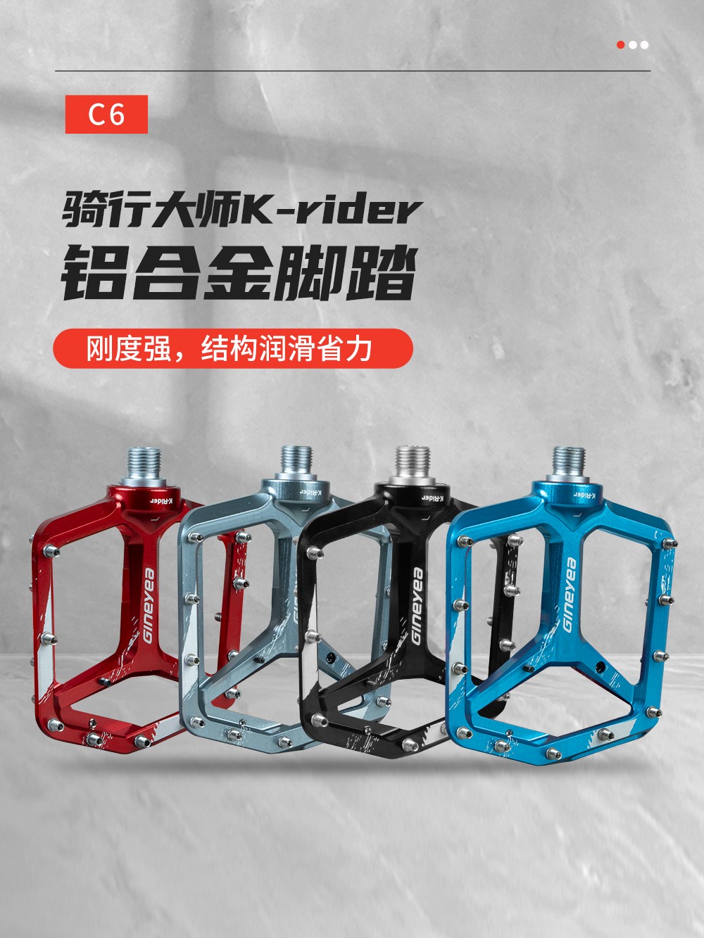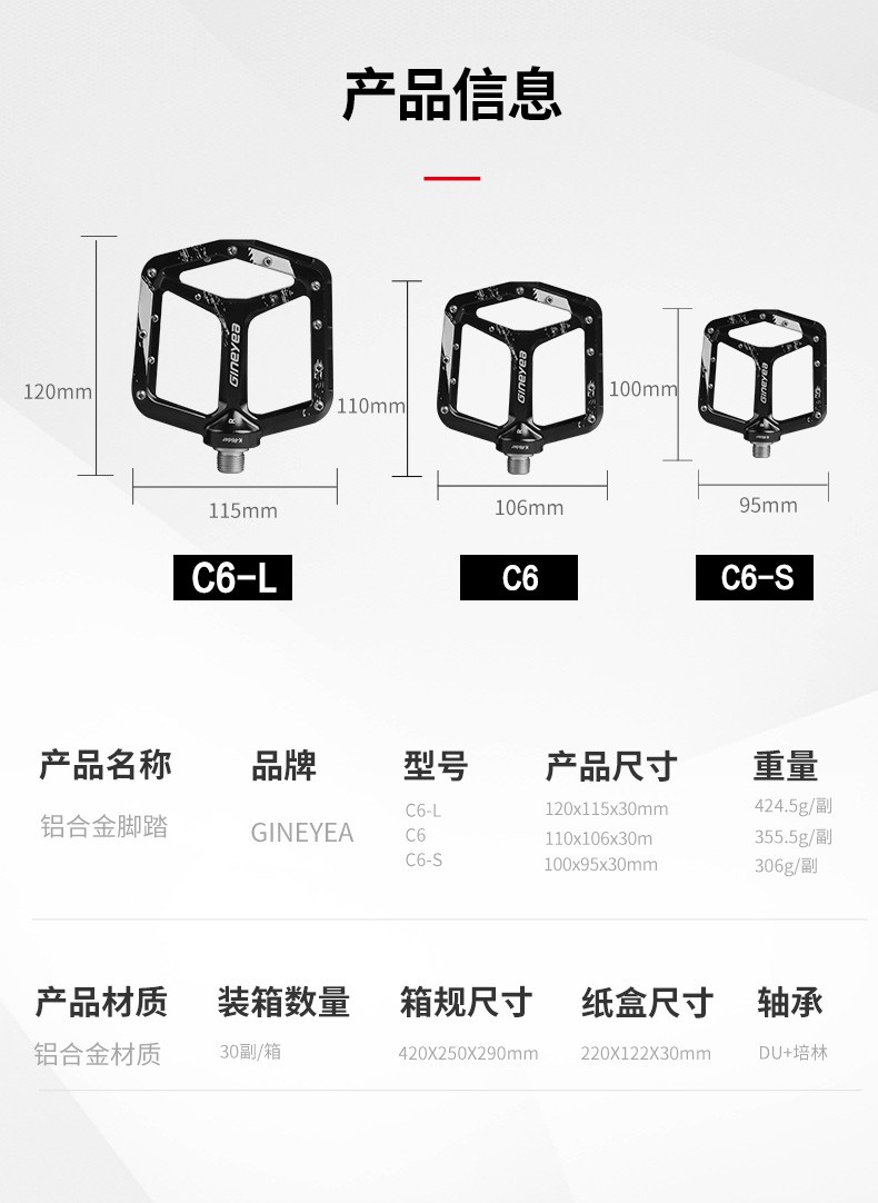 景曄新款C6系列外觀設計比較個性化,造型設計相同,采用嵌套軸心的一個設計,所有邊角尖銳凸起除都經過細致打磨,鋁合金CNC本體,珞鉬鋼軸心,騎行更省力,采用大軸承+襯套的一個設計,尺寸分大中小,大號用于速降,中號用于CX,林道,泵道,小號用于童車